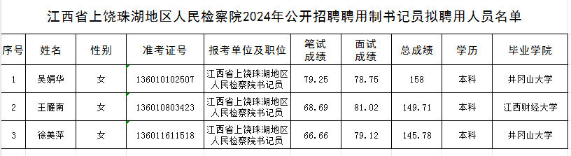 江西省上饶珠湖地区人民检察院2024年度公开招聘聘用制书记员拟聘用人员公示