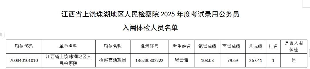 附件:江西省上饶珠湖地区人民检察院2025年度考试录用公务员入闱体检人员名单