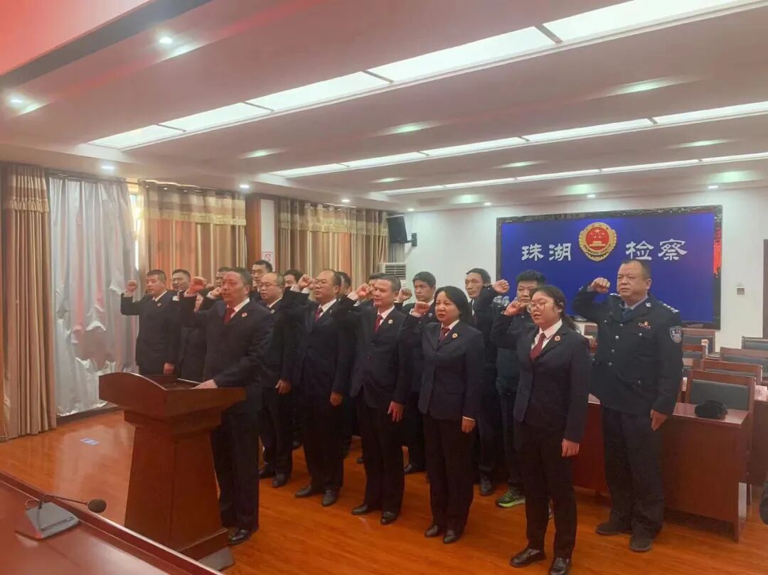 为大力弘扬宪法精神、树立宪法权威,珠湖检察院举行宪法宣誓仪式。分党组书记、检察长周印军带领全体检察干警面对国旗右手举拳庄严宣誓,郑重承诺对宪法的尊崇、对使命的坚守。